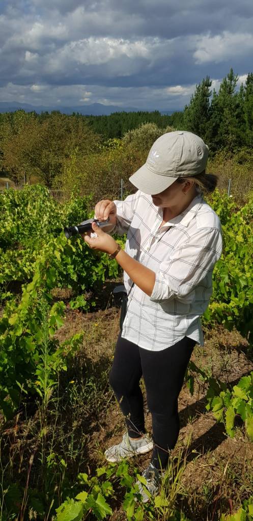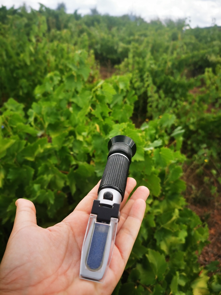 Quedamos a las 9 de mañana y recorremos varias parcelas. ‘Vamos a ir a tu viña porque esté año enveró antes y está bastante avanzada’. Llevamos el refractómetro, un instrumento que mide el contenido de azúcar de una muestra líquida a través de la refracción de la luz. Cuánto más azúcar hay, el índice de refracción es mayor. A partir del índice de refracción podemos conocer la concentración de azúcar (medida en grados Brix) y el grado de alcohol probable.