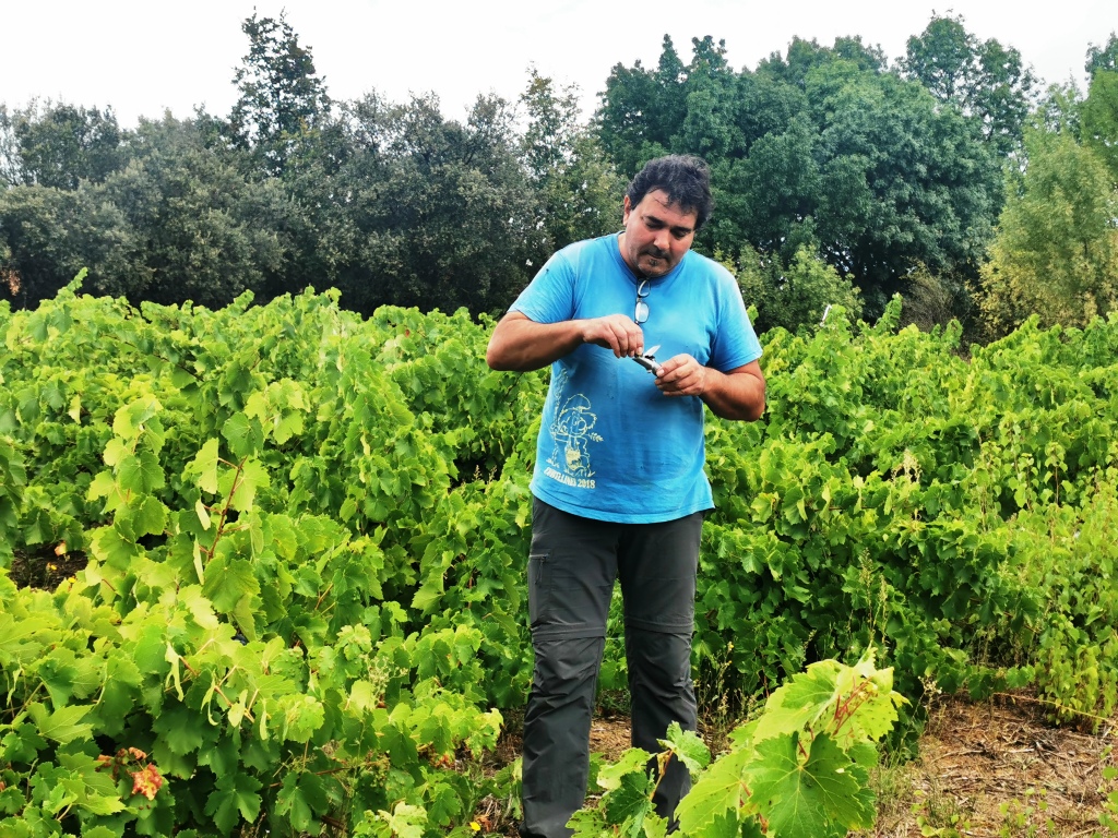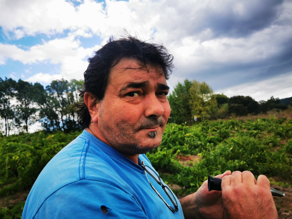 Para Suso es muy fácil. Lleva haciéndolo media vida y con solo un rápido vistazo ya sabe qué bayas escoger, aplasta la uva entre sus dedos para ver si es fácil romper el hollejo, la prueba, mastica las semillas y en su cara puede verse si está dulce (sonríe), si no lo está (niega con la cabeza), si esta ácida (encoge la nariz), si está verde (escupe la piel), si sabe poco (encoge los hombros y hace una pequeña mueca)…. ¿Qué opinas? ‘Pues que la maduración va lenta y que nos queda aún por lo menos una semana para arrancar’. Pero Suso sabe que todo puede cambiar muy rápido y por eso no se relaja y recorre cada mañana las viñas. También para observar si el agua, los corzos o los jabalíes han provocado daños. ‘Hay que avisar a los cazadores porque el jabalí ha vuelto a entrar en algunas parcelas que no están valladas’. Hacemos fotos y se las mandamos a los cazadores. Van a ser diez días de larga espera. Seguimos con los dedos cruzados.