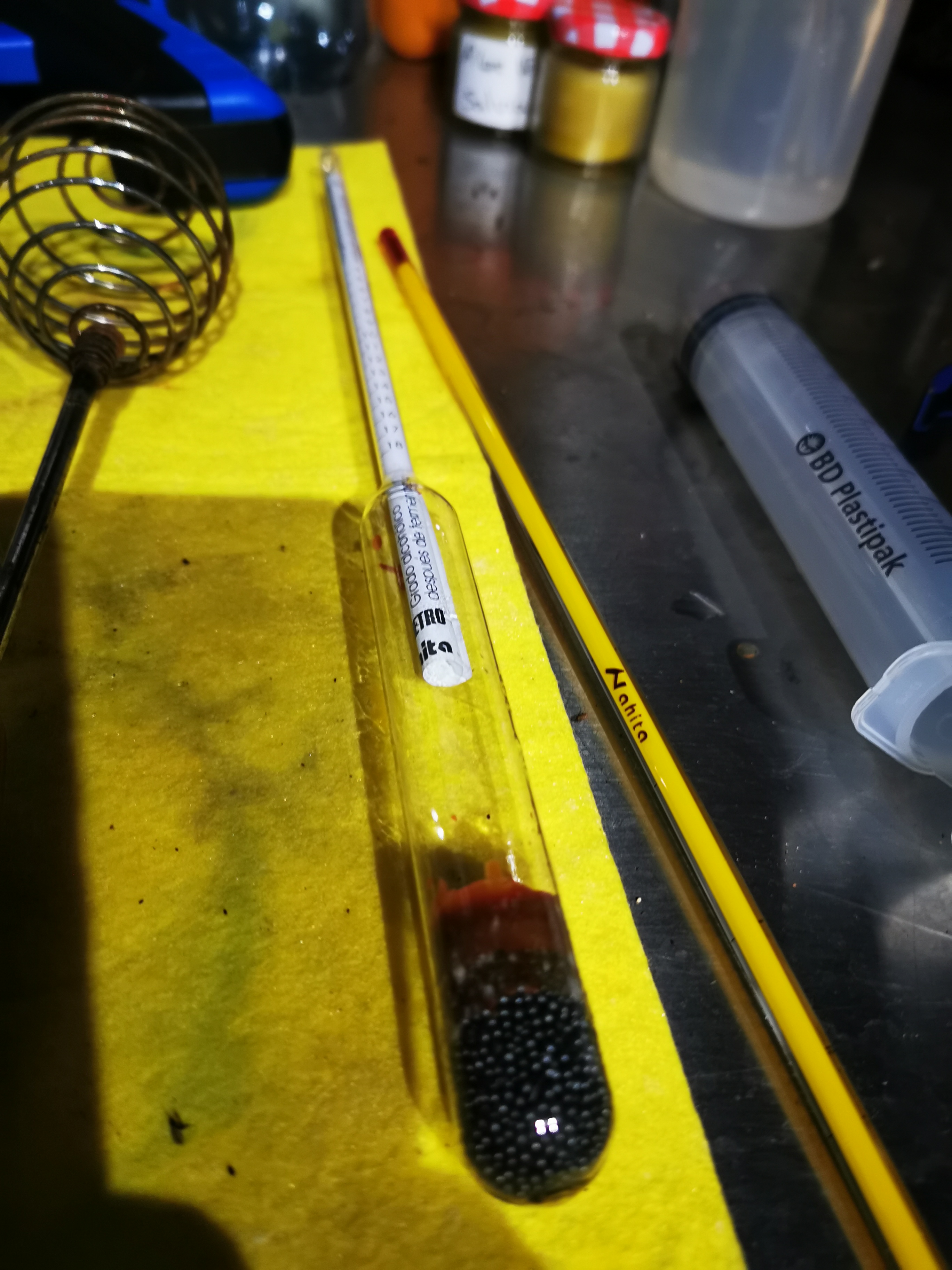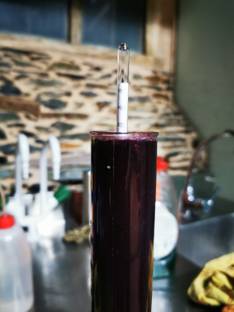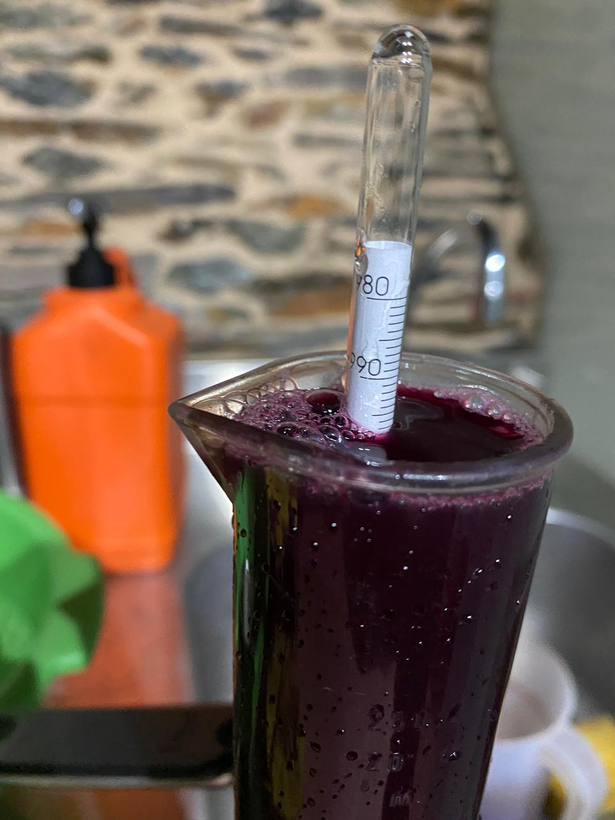 • Densidad. Utilizamos un densímetro que nos indica la cantidad de azúcar que queda en el mosto. A medida que los azúcares se convierten en alcohol, la densidad baja. Lo medimos llenando una probeta con el mosto y dejando flotar en él el densímetro. Se considera que la fermentación ha terminado al alcanzar densidades próximas a 995. Alcanzado este parámetro podemos ya descubar o dejar el contenido macerando por más tiempo.