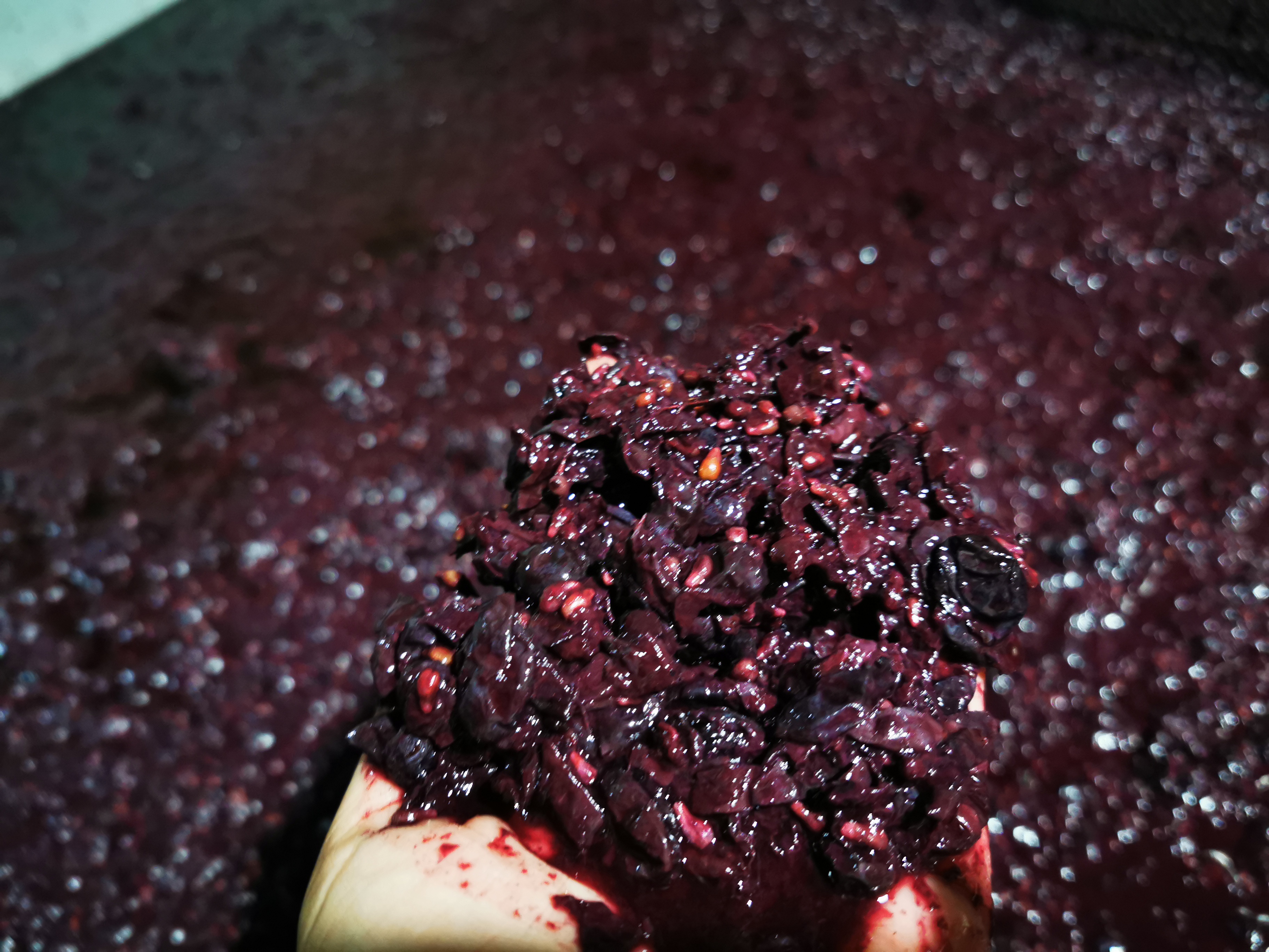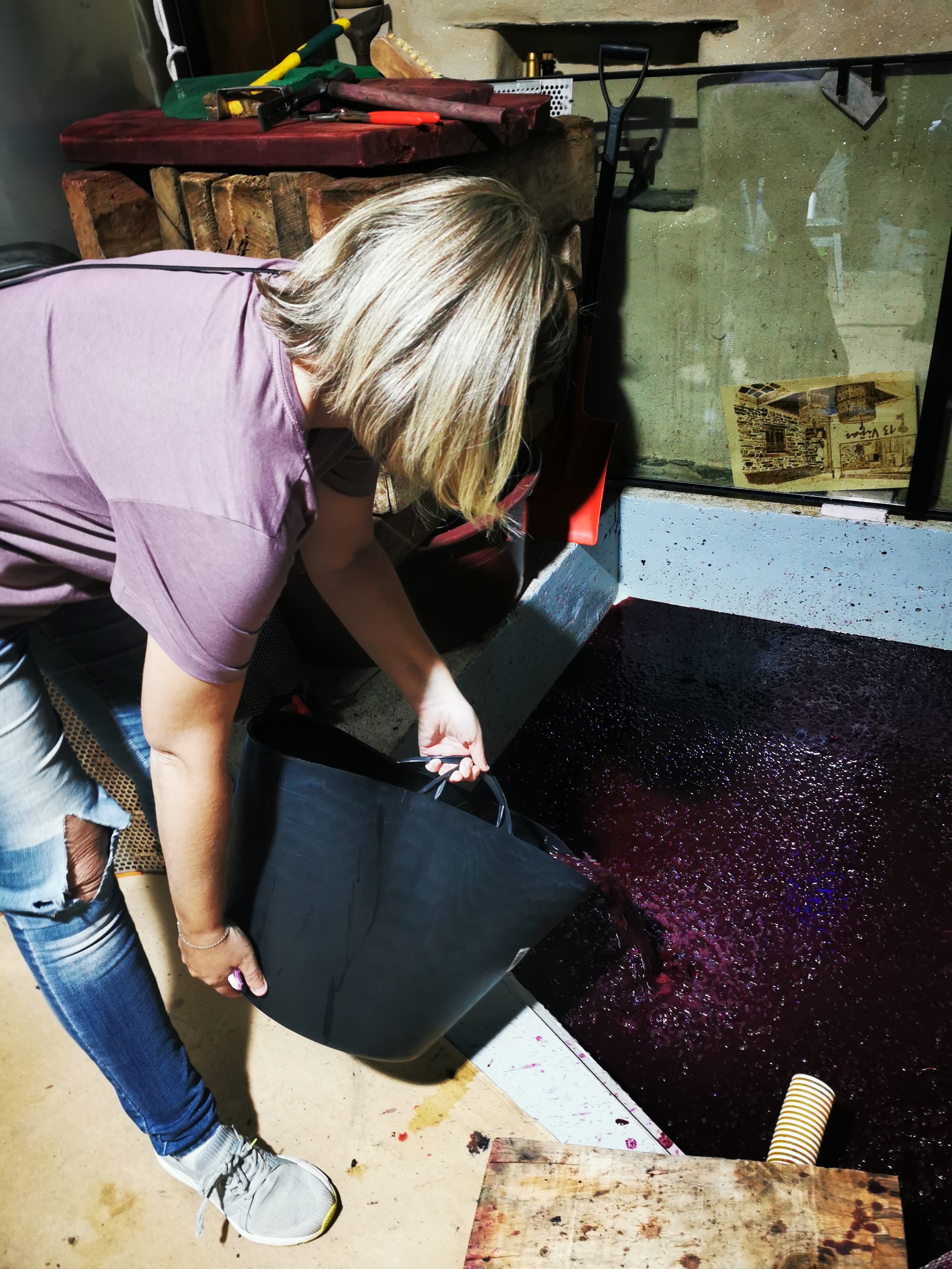 El vino se esparce por la lagareta pero, de repente, apenas han salido unos litros, para de verter. ‘Seguramente será un racimo. A veces pasa. Se meten en el grifo y se atasca’, dice Julio. No usamos bomba, la operación de vaciado es simplemente por gravedad y como nuestro depósito es pequeño, no hay manera de desatascar ese racimo. Así, que optamos por el método tradicional. Es decir, lo sacaremos a calderos. Nos interesa no remover excesivamente el líquido y sacar el vino poco a poco hasta llegar a los posos, esa masa de hollejos, pepitas y las madres del vino, es decir, los precipitados que se forman durante la fermentación.