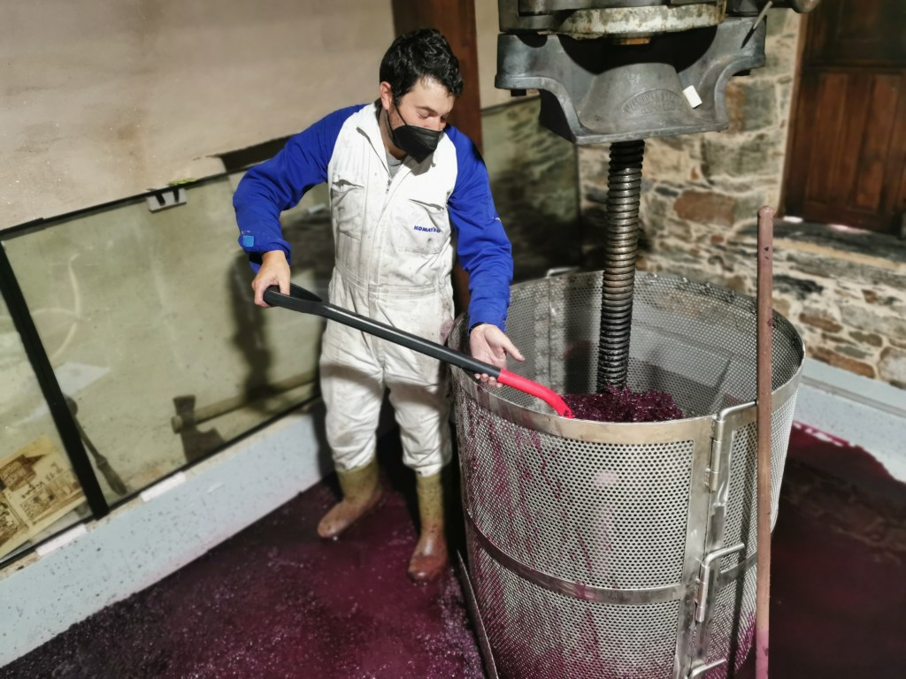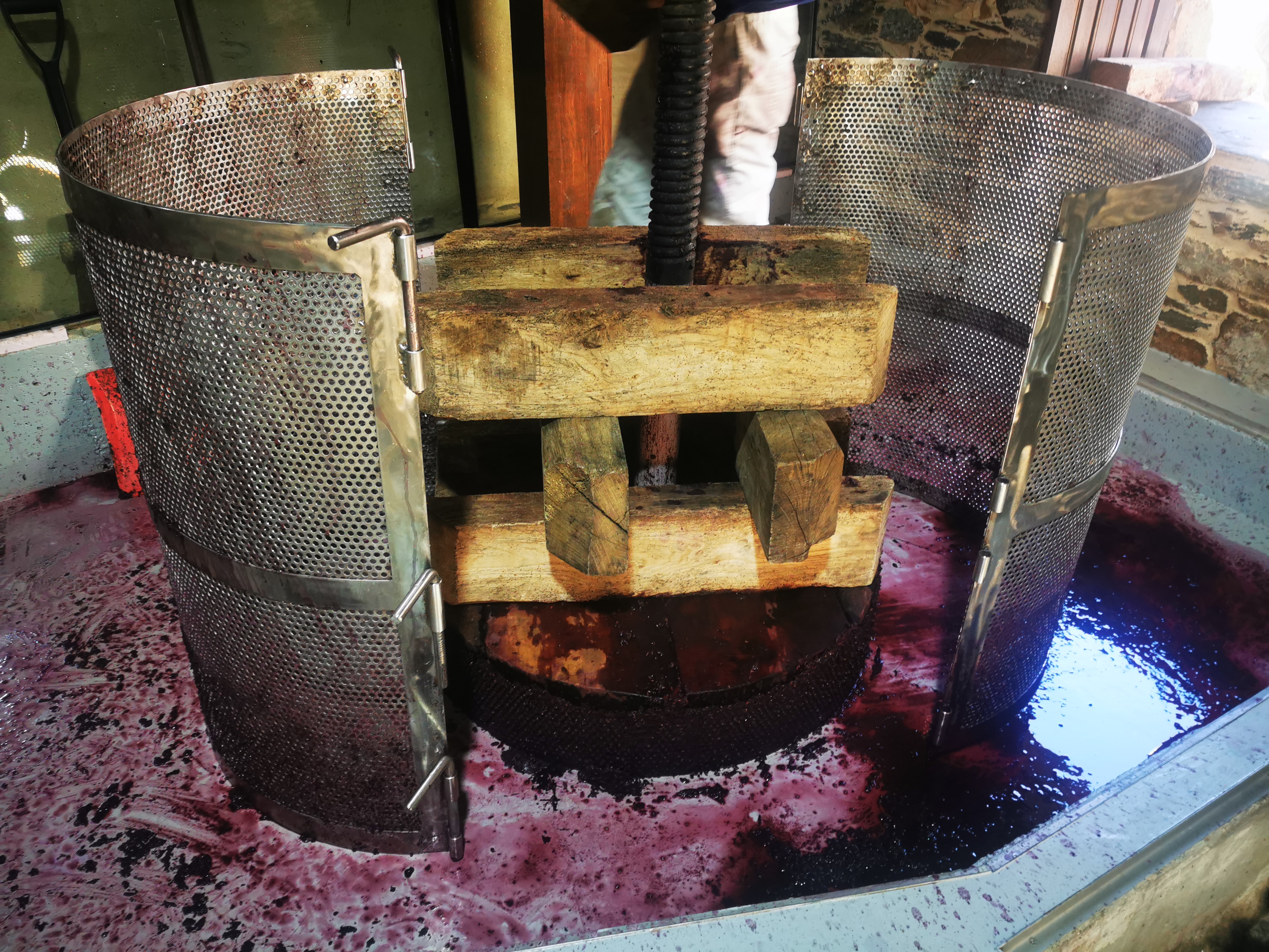 Caldero a caldero, vaciamos el depósito y la parte final la vertemos directamente en la prensa. Es una prensa vertical, de 80 años de antigüedad, a la que han adaptado una jaula de acero inoxidable que resulta más higiénica que la madera. La usaremos solo para agrupar el bagazo y favorecer que el líquido fluya poco a poco al exterior por las pequeñas aperturas de la jaula cilíndrica, sin prensar. No nos interesa ejercer demasiada presión en las pieles ni romper las pepitas de la uva para evitar extraer aromas y jugos de la estructura vegetal que puedan conferir al vino olores y sabores demasiado herbáceos. Ese se denomina vino de prensa y aunque resulta algo más potente y astringente, también concentra más propiedades y taninos que enriquecerán nuestro vino. Una vez hemos sacado ese líquido, el resto, los orujos, suelen usarse para la destilación, y por tanto para conseguir alcohol vínico.