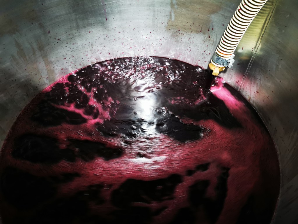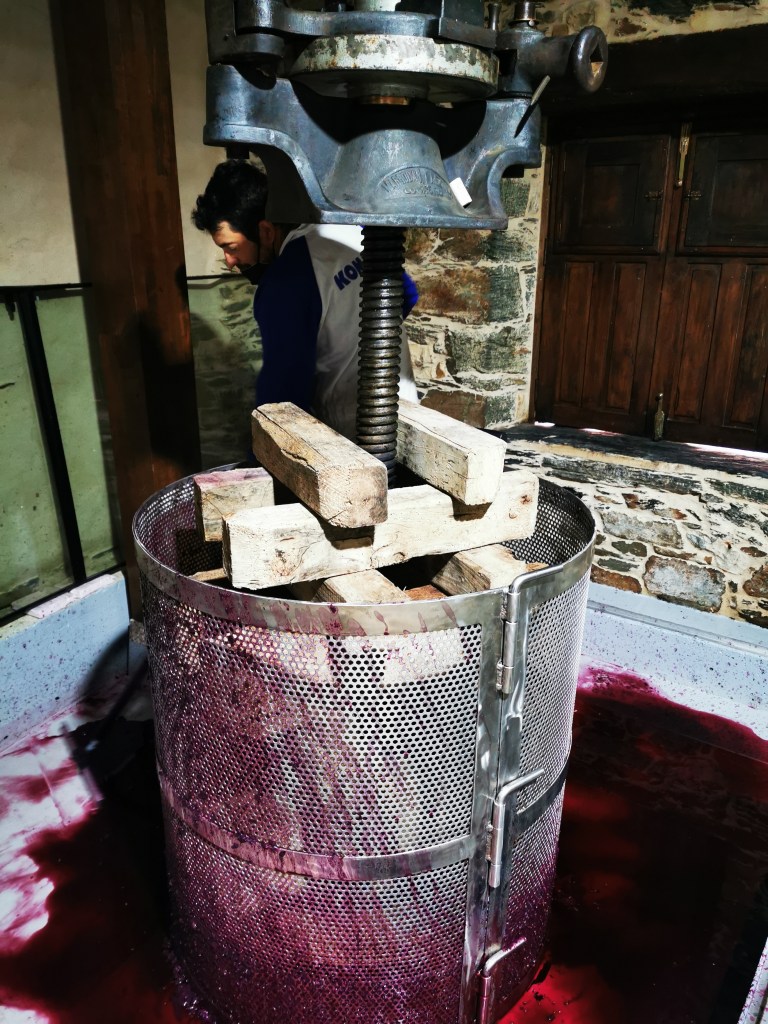 Llegó el día. Julio nos convoca a las nueve de la mañana en bodega para llevar a cabo el descube y prensado de nuestro vino. El descube consiste en separar los sólidos del líquido, es decir, el vino de sus hollejos o pieles. Para ello, conectamos una manguera en uno de los grifos del depósito con el fin de trasegar el líquido al lagar donde está montada la prensa. Ese líquido es lo que se llama vino de flor o vino de yema, fruto del escurrido natural de la uva. Es, generalmente un vino de mayor calidad, más rico en alcohol y en compuestos fenólicos. Julio me emplaza a que sea yo quien haga los honores y abra el grifo para dar inicio al proceso… Lo abro y el vino, de color rojo vivo con tonos violáceos, empieza a salir por la manguera. Momentazo. Hay emoción y mucha expectación.