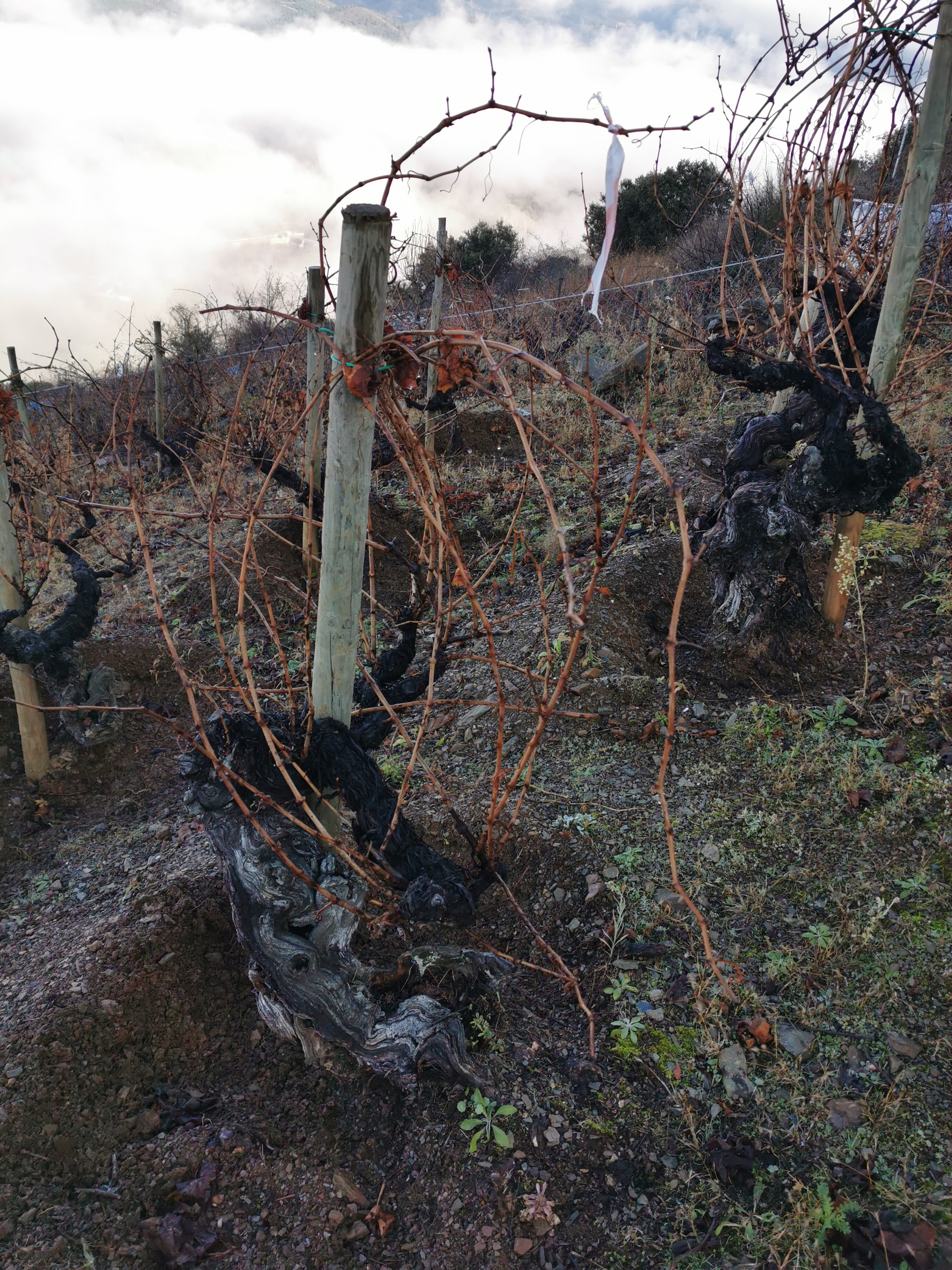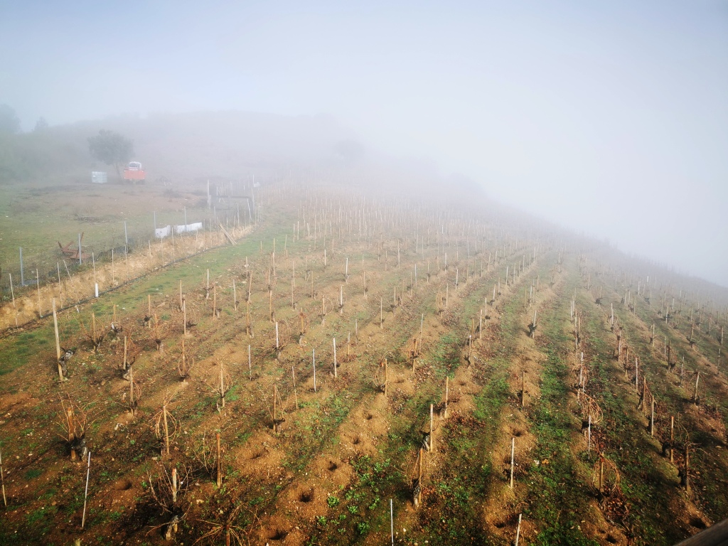 Para ello, Nacho y Jose ponen todos sus esfuerzos en las viñas, podadas y conducidas en vaso, trabajadas manualmente y bajo los principios de la viticultura orgánica y sostenible. ‘Es complicado y los primeros años pierdes prácticamente toda la producción pero la planta se recupera, se defiende y al final se regula’. Se trata, dicen, de eliminar los productos químicos para extraer la expresión óptima de la uva y del terroir. ‘Hay que conocer la planta, la tierra, su lenguaje y trabajarla adecuadamente porque cada parcela es diferente’. Por eso vemos en sus viñedos diferentes técnicas de laboreo: cepas con los sarmientos atados, con estacas de soporte, en bancales, con hileras aradas o con hoyos o piletas alrededor de la cepa. ‘El tipo de mantenimiento del suelo ejerce una influencia enorme en el comportamiento del viñedo. Hay que adaptarse a cada parcela, según sus características y problemática: falta de agua, escorrentías, exceso de viento, falta de nutrientes…’. Los hoyos, por ejemplo, les permite recoger el agua de lluvia y facilita su infiltración. ‘Conservar el suelo y el agua es conservar el capital del viñedo’.