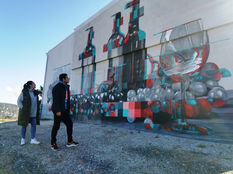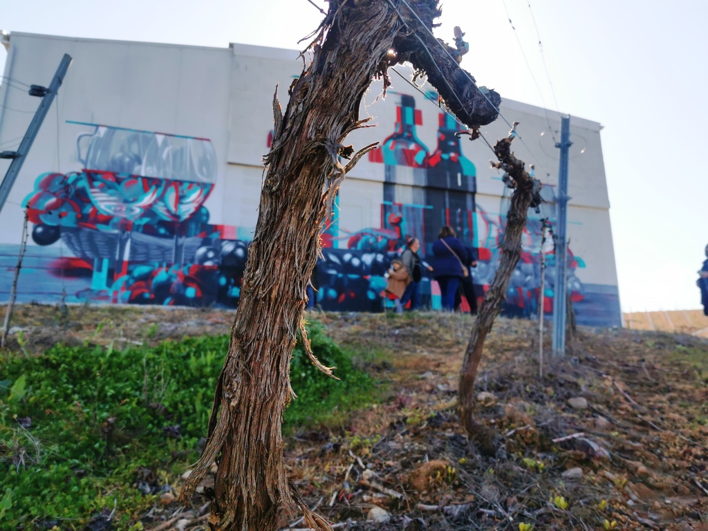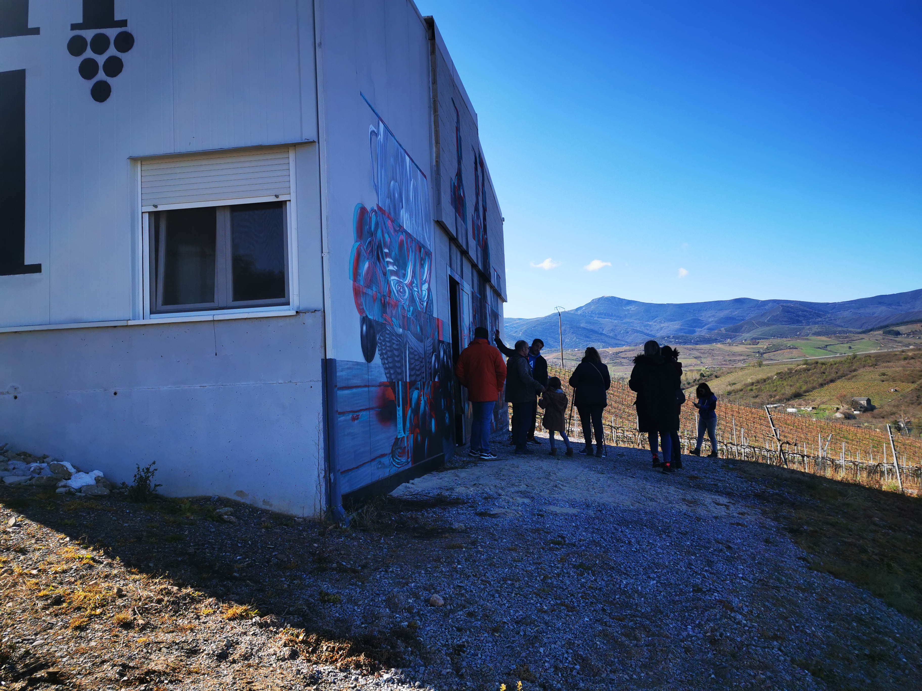 La bodega se divide en tres naves, dos junto a la casa familiar donde se encuentra la zona de elaboración, embotellado, laboratorio y almacén. Mientras que la zona de envejecimiento se sitúa en una tercera nave semienterrada en lo alto de la colina, donde las barricas, de roble francés y americano, reposan frescas, a oscuras y en silencio. En el exterior, sin embargo, el mural del artista contemporáneo Asier, nos transporta a un mundo más joven y urbano. ‘Nos gusta pensar que el campo y la viticultura no tiene porqué estar reñida con lo urbano’. Y, sin duda, esa frase se convierte en un excelente reclamo.