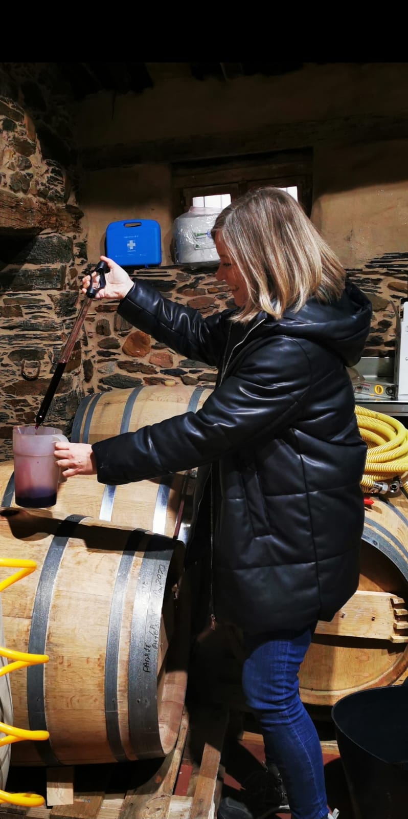 ‘Haz los honores, Maite’, me dice Julio, empoderándome. ‘Es tu vino’. Él lo dice y yo tengo que hacer un esfuerzo para actuar como bodeguera. Pero cojo la pipeta toma muestras y deposito el vino extraído de la barrica en una jarra mientra Julio prepara las copas.