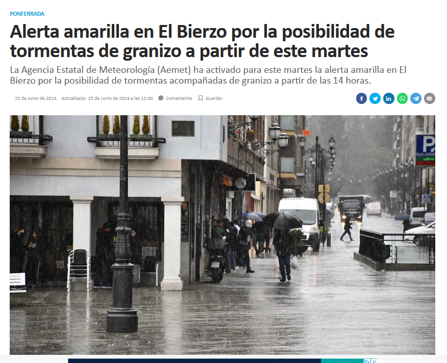 Me levanto la mañana del martes 25 de junio y el primer mensaje del día de Julio es de nuevo el aviso de la Agencia Estatal de Meteorología. Aemet ha activado para este martes la alerta amarilla en El Bierzo por la posibilidad de tormentas acompañadas de granizo a partir de las 14 horas. No hay tregua. De nuevo, el corazón encogido. Escucho de fondo a Rigoberta Bandini: ‘Mi abuela me lo repetía siempre / Lo que tiene que ser, será igualmente / Y a ver qué passa, a ver qué passa, a ver qué pasa…’.