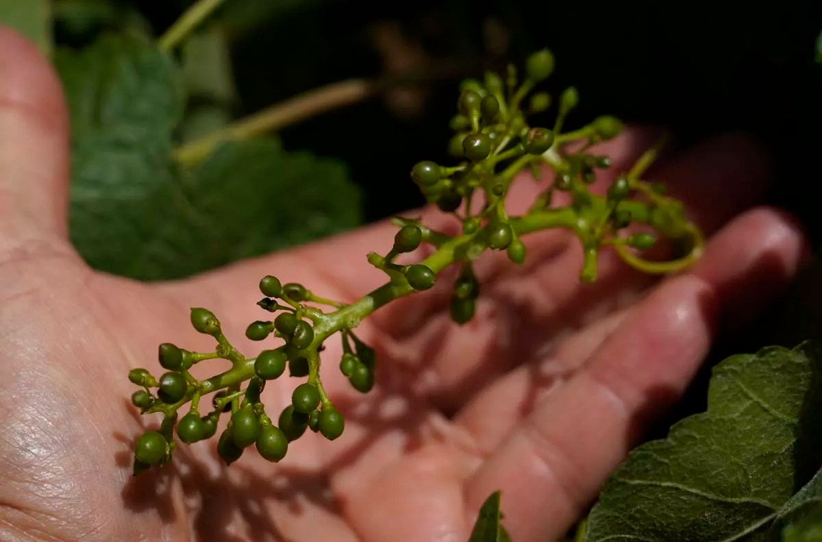 Julio nos tranquiliza: ‘Aquí libramos por ahora, aunque habrá que ir a echar un vistazo más a fondo’. Saben que las condiciones húmedas que suelen acompañar a las tormentas de granizo pueden favorecer ahora la proliferación de enfermedades fúngicas, empeorando la situación. La floración de la vid marca el inicio de la vendimia y el volumen de la cosecha. Las bonitas y diminutas flores blancas se abren esperando a ser polinizadas por el viento y los insectos y eso da lugar a los granos de las uvas que formarán los racimos. De hecho, en algunas parcelas más avanzadas ya se podían apreciar las bayas con forma y tamaño de un guisante.