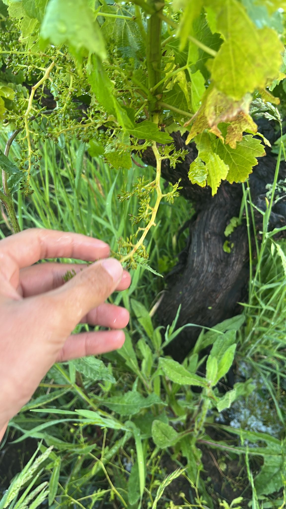 Julio nos dice: ¡Llevamos un invierno y primavera muy lluviosos, récord de precipitaciones, y eso marcará seguro el perfil de los vinos. Vamos a ir a ver las viñas y en función de cómo evolucione todo y el clima de los próximos días, trabajaremos para evitar los brotes de hongos pero… tranquilidad y paso a paso’. Toca esperar y confiar.