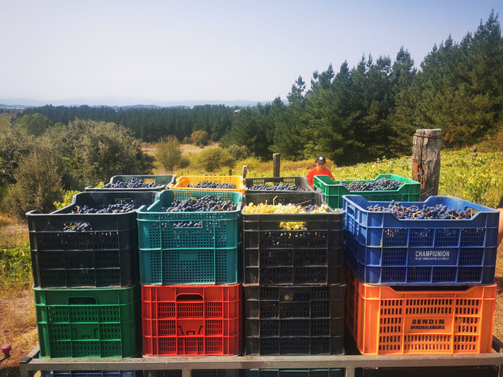 Cuando las jaulas están rebosantes de uvas y no quedan ya racimos en las cepas, llega el momento de cargar y despedirnos. Llevamos las cajas al remolque, vamos a pesar y rumbo a la bodega. El trabajo en el campo ha terminado, pero la aventura continua.