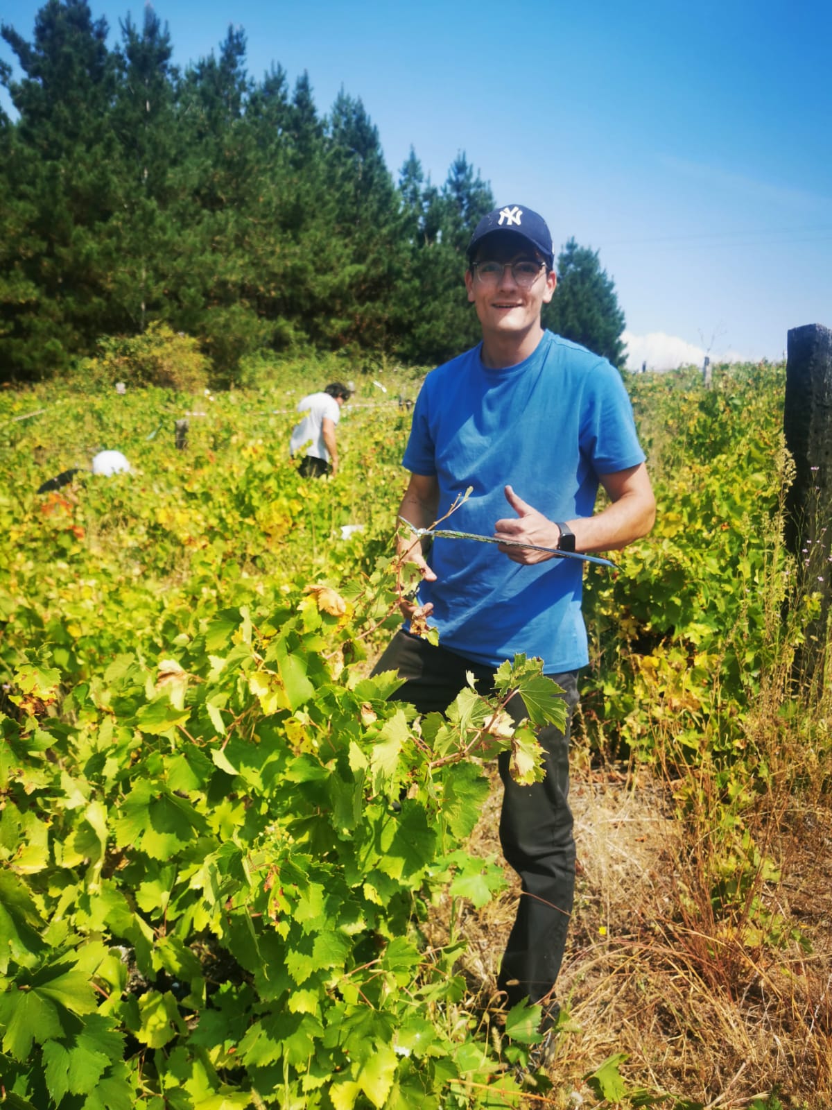 Si eres de los que piensa que todas las uvas son iguales… ¡error! Aquí hay que ir con ojo clínico: queremos racimos sanos para elaborar un buen vino. Sin restos de mildiu ni podredumbre ni trozos comidos (corzos, pájaros y abejas). Pero la producción este año es escasa, así que no podemos seleccionar como el año pasado. Me quedo con racimos grandes y pequeños, uvas tintas y blancas, más maduras y menos y hasta con alguno de esos pequeños racimitos extra en los zarcillos que confio nos aporten algo de acidez.