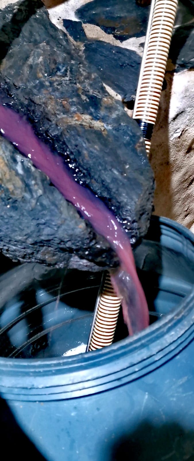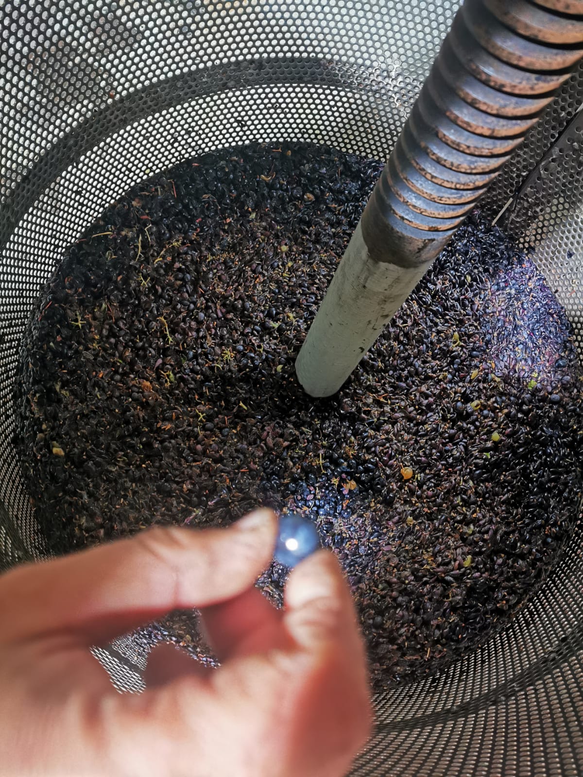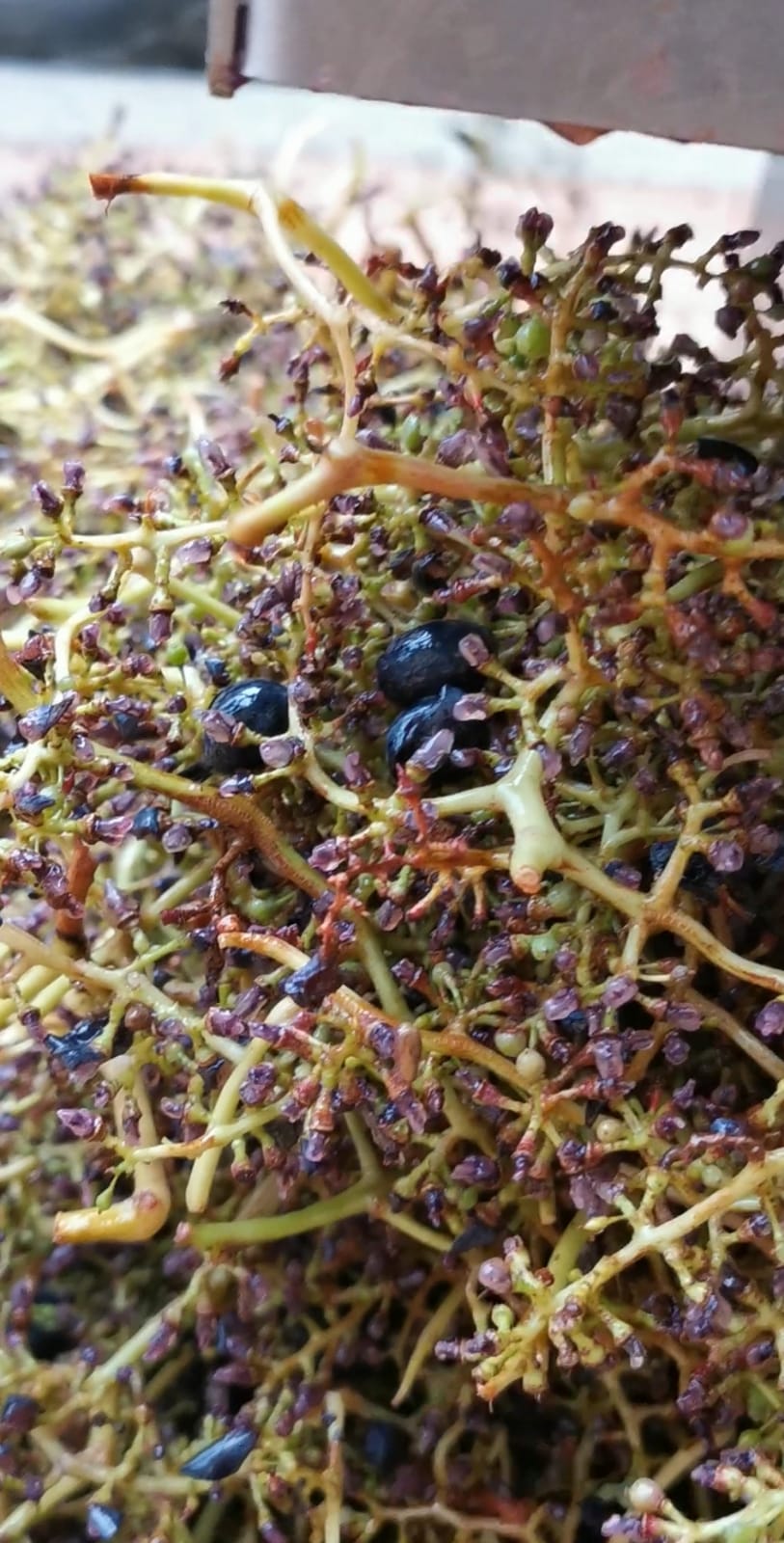 Obtenemos un poco más de mosto y de un color más rojo. ‘¿Quieres que apretemos un poco con la prensa? Aún hay uvas sin estrujar‘, me dice Julio. Pero lo descarto, prefiero perder mosto y quedarme solo con ese mosto flor de calidad. También me da miedo tintar demasiado el jugo.