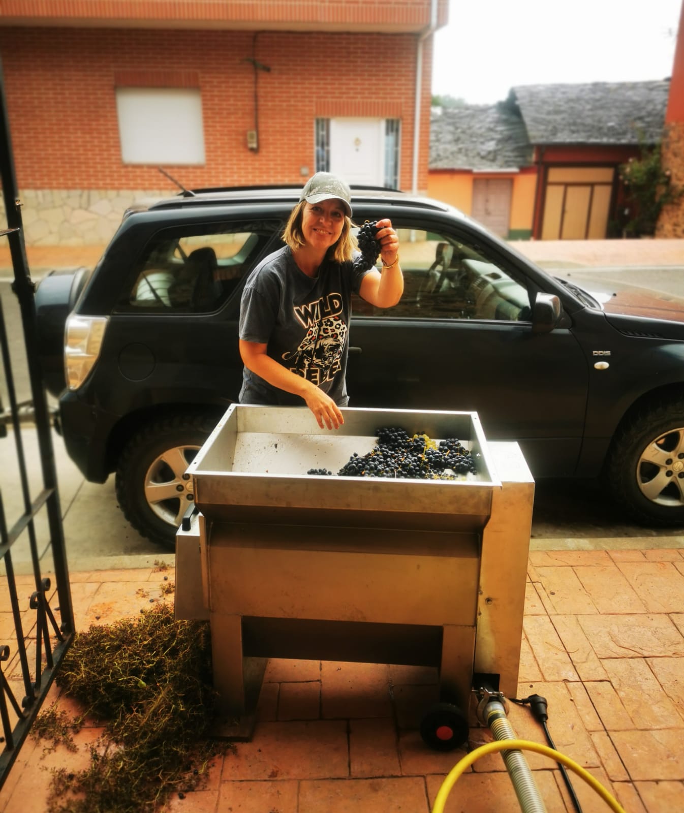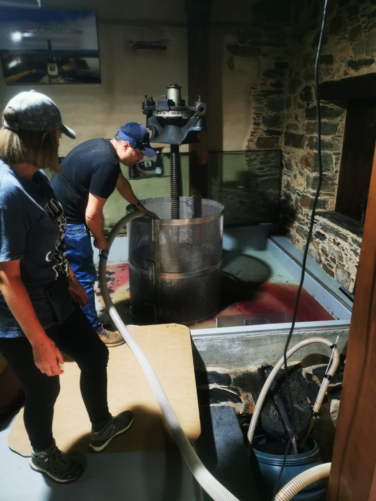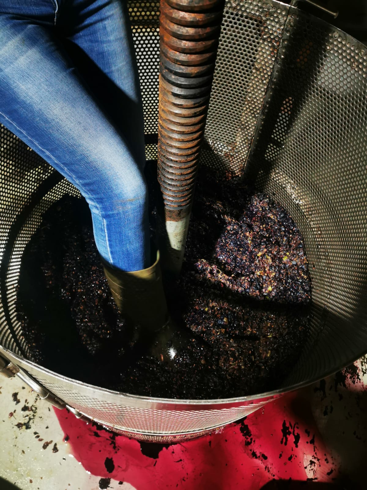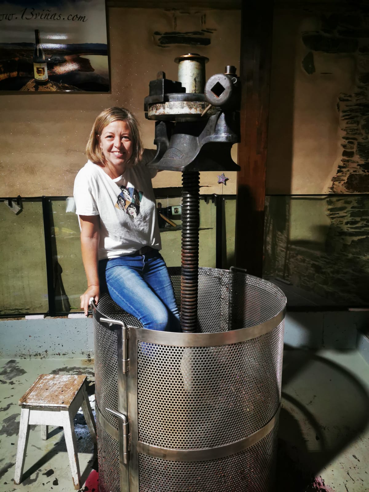 Dejamos que la fuerza universal de la gravedad siga actuando unas horas antes de pasar al estrujado o lo que yo denomino, el arte de pisar la uva. No queremos prensar porque queremos evitar que se rompan las pepitas que contienen las uvas y nos den sabores amargos al mosto pero quedan muchas uvas enteras que aún contienen el mosto en su interior. Para tratar de romper las bayas, entro en la jaula de la prensa y las piso yo misma como se hacía tradicionalmente. Tenemos la suerte de conservar el lagar y siempre, siempre todos los vinos de 13 Viñas pasan por el lagar y por la piedra labrada. ¿Cuántos vinos habrán pasado por esa piedra? ¿Cuántos siglos en funcionamiento? En fin, la pisada a pie de las uvas está resurgiendo. Muchos productores recuperan los métodos tradicionales de vinificación porque dan un carácter auténtico y distintivo a los vinos. Evoca a la historia del vino, te conecta con el proceso y además permite una extracción más suave de los compuestos de la uva que la intervención mecánica.