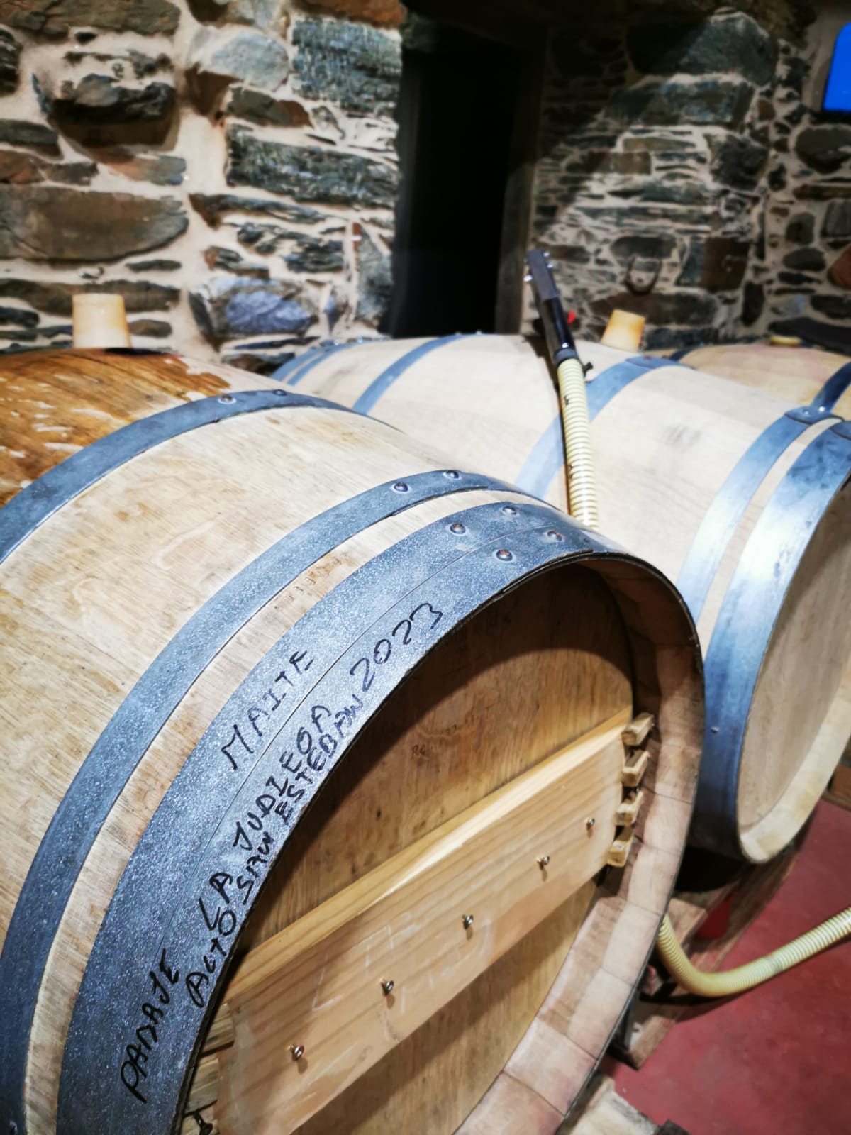 El mosto sigue fluyendo. Pasa por la lagareta hasta un recipiente y de ahí lo bombeamos directamente al depósito escogido para la fermentación, dos barricas de roble francés usadas. Podríamos haber escogido un depósito de inox o de barro, pero escogimos la madera. Al ser barrica de sexto y septimo uso, el aporte de aromas será insignificante pero la madera nos permitirá que el vino gane en complejidad y elegancia. O eso esperamos.