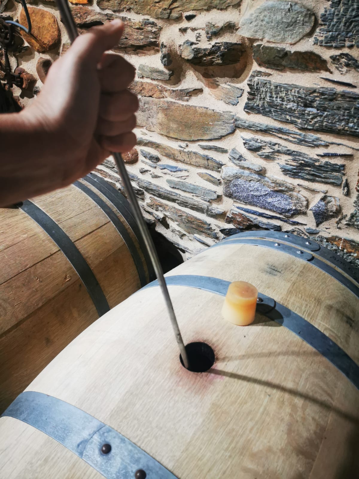 Para el batonnage, Julio utiliza una varilla metálica, la introduce por el orificio de la barrica y remueve el fondo de forma circular, con cuidado para no incorporar oxígeno al líquido. Este movimiento pone las lías en suspensión y potencia su contacto con el vino. Confiamos que ello nos aporte los beneficios que buscamos y nos ayude a mantener el vino protegido de oxidaciones indeseadas al crear una atmósfera reductora dentro de la barrica.