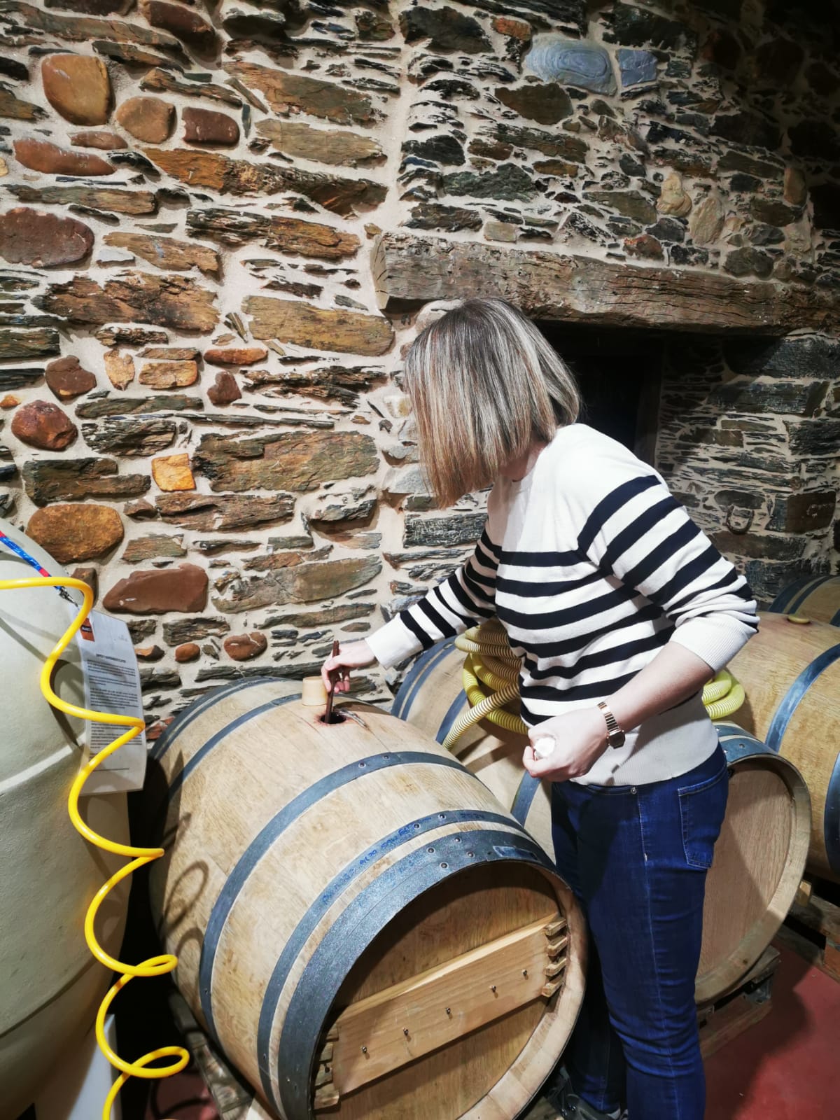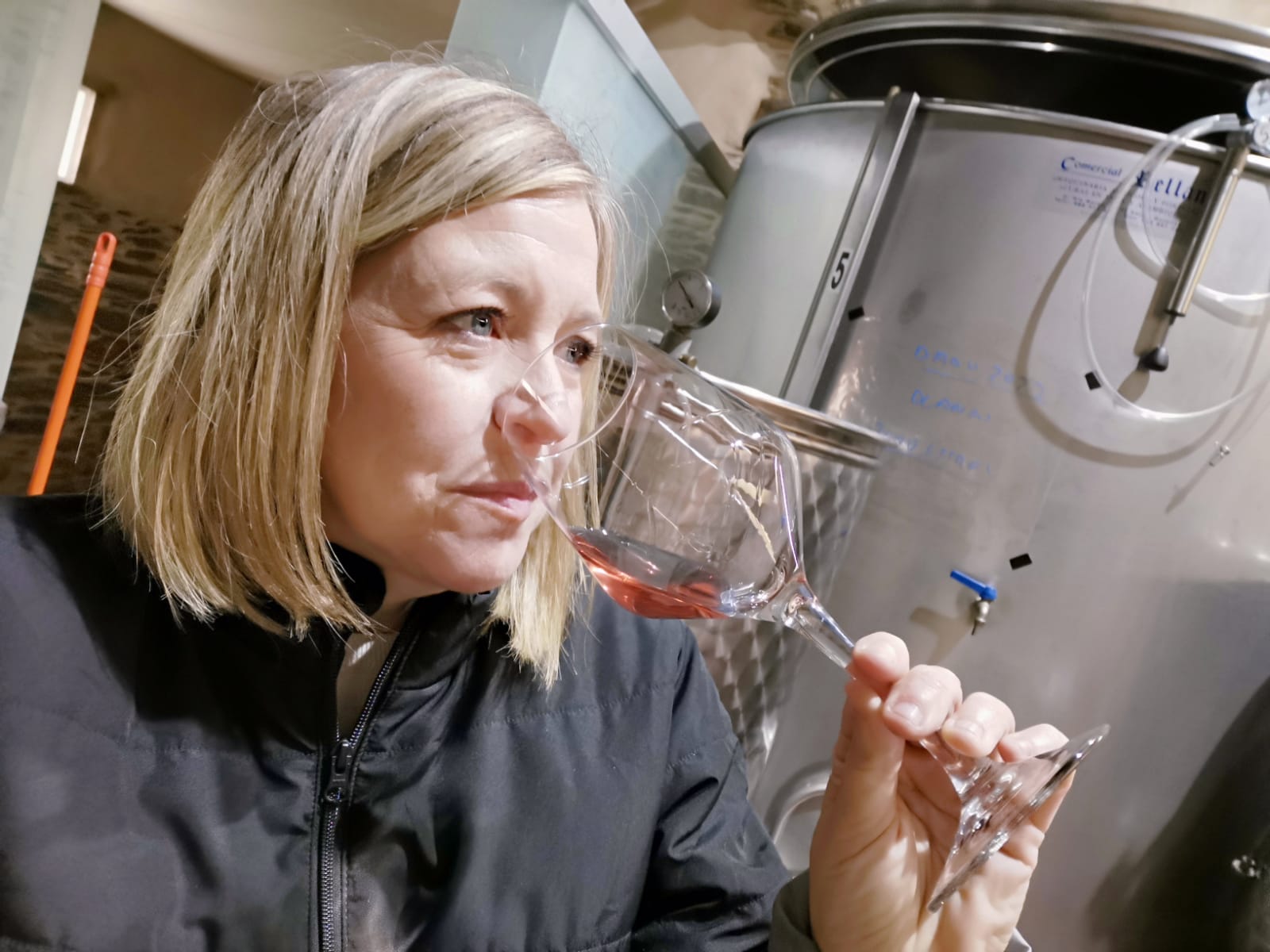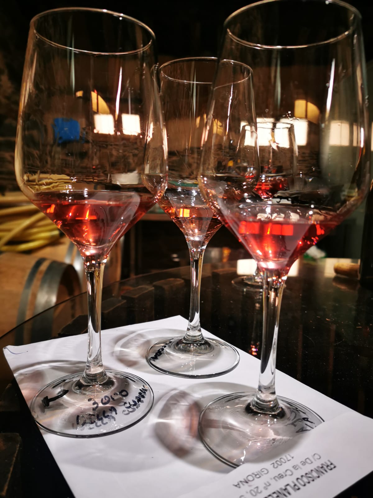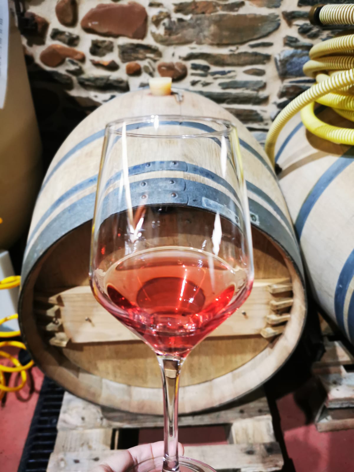 Probamos la mezcla: 84% barrica, 16% inox. Y de golpe, el vino encuentra su forma. El color es un rosa más profundo que la media, pero elegante. En nariz, la fruta se siente fresca, delicada, con toques secos y especiados. Hay volumen, pero también chispa. La boca es envolvente, supersedoso -probablemente es la glicerina- pero no se hace pesado.