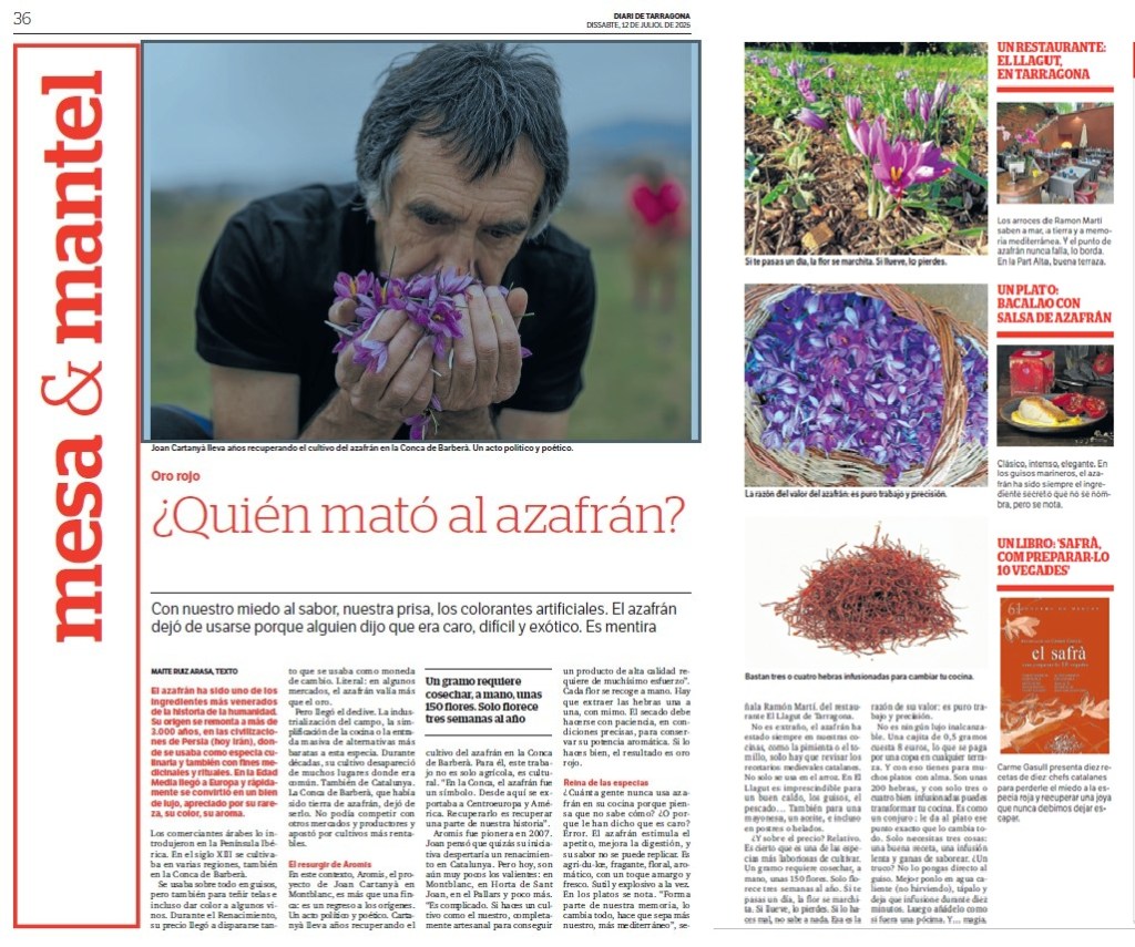 ¿Cuánta gente no ha usado nunca azafrán en su cocina porque piensa que no sabe cómo? ¿O porque le han dicho que es caro? Error. El azafrán estimula el apetito, mejora la digestión, y su sabor no se puede replicar. Es agridulce, fragante, floral, aromático, con un toque amargo y fresco. Sutil y explosivo a la vez. En los platos, se nota. ‘Forma parte de nuestra memoria, lo cambia todo, hace que sepa más nuestro, más mediterráneo’, señala Ramón Martí del restaurante El Llagut en Tarragona. No es extraño, el azafrán ha estado siempre en nuestras cocinas, como la pimienta o el tomillo, solo hay que revisar los recetarios medievales catalanes. Y no solo se usa en el arroz, para El Llagut es imprescindible para un buen caldo, los guisos, el pescado, pero también para una mayonesa, un aceite, e incluso en postres o helados.
