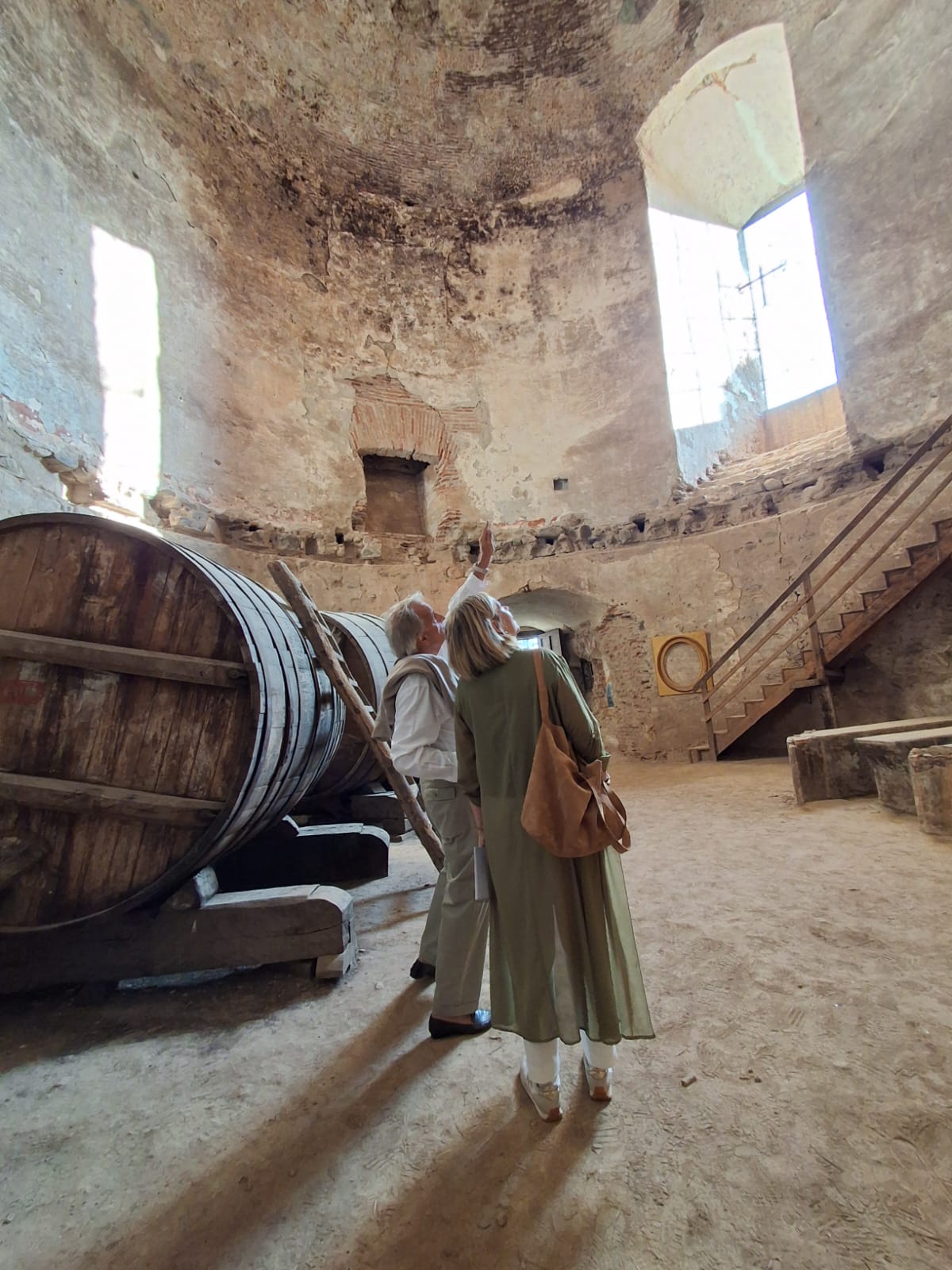 Visitamos la vieja bodega, situada en un torreón, el único que no ha sido reformado: aún guarda toneles gigantes de madera que parecen esculturas. Pero transformarla en una instalación moderna exigiría un proyecto colosal. ‘No lo descarto, me encantaría recuperar la bodega del Castillo y que nuestro vino insignia se elaborara aquí’.