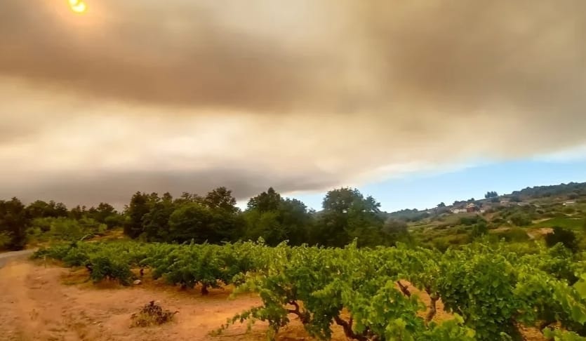 El viñedo lo cuenta todo sin palabras: Cuatro meses de sequía, agosto con temperaturas disparadas y los incendios acechando a pocos kilómetros, añadiendo humo y calor abrasador.